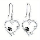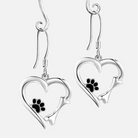 Silver dangling earrings with heart and paw print design